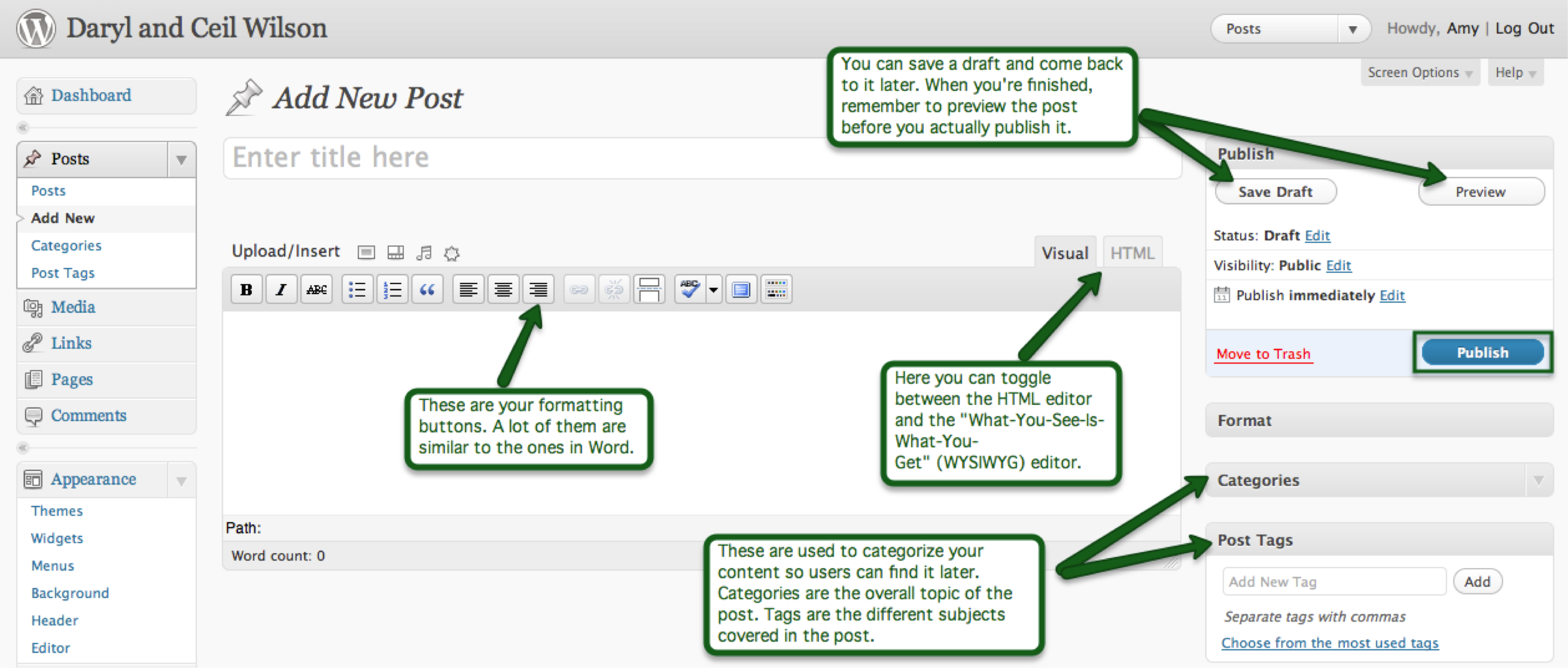 But, before you’ve done that, Jing also allows you to mark-up your image by circling part of it, drawing an arrow to highlight a certain phrase, even writing a little caption. For example, say that you’re writing a how-to-use-Wordpress guide for your mother, who lives in another state. Instead of having to call her and try to explain to her where on the screen she needs to look, you can just make a handy dandy little graphic like this one: